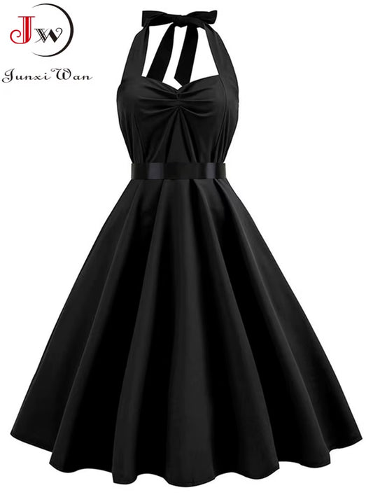 Sexy Halter Party Dress Women Summer Backless Vintage Dresses Retro Rockabilly Swing Robe Femme Elegant Midi Sundress